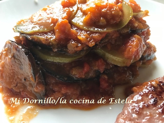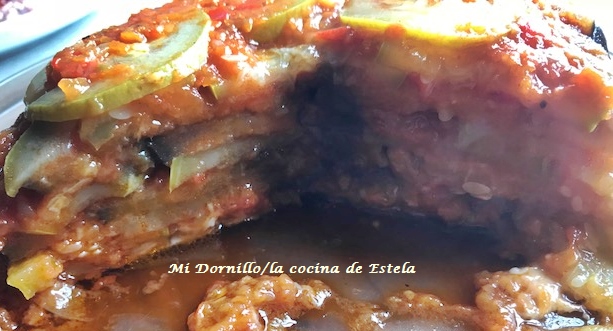 En una fuente para el horno ponemos un poco del sofrito de verdura, una capa de calabacines en rojas, sofrito, berenjenas en rodajas, sofrito, calabacines... asi hasta terminar toda las verdura y terminaremos con una capa del sofrito de tomate. Espolvorear con el queso rallado. Tapamos el recipiente con papel de albal.
