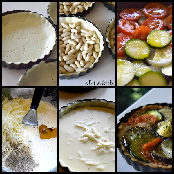 ¡Vamos a ello! al final tenéis un paso a paso por si tenéis alguna duda.Sacamos la pasta brisa unos minutos antes de usarla y teniéndola sobre el papel, yo le paso un rodillo por encima estirándola para darle un poco mas de si, y la cortamos en redondeles con una circunferencia, un dedo o dos mas grande, que la base de la tartaleta. Vamos colocando los círculos de masa sobre los moldes adaptándolos al fondo y a las paredes y cortamos la masa sobrante. Esos restos los volvemos a amasar y a estirar y nos salen otras dos, a mi me ha dado para 6 tartaletas. Con un tenedor pinchamos la base y la rellenamos con legumbres para que no se levante al hornearla Cocemos a 180º C durante unos 10 o 15 mts. Al terminar sacamos, quitamos las habichuelas, y reservamos.