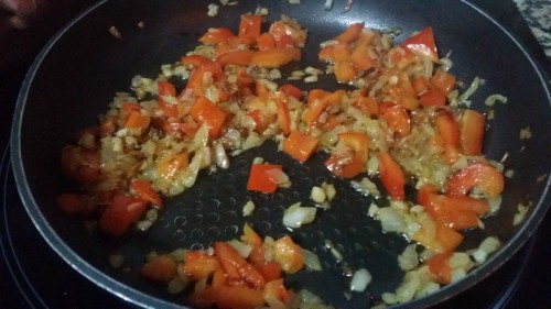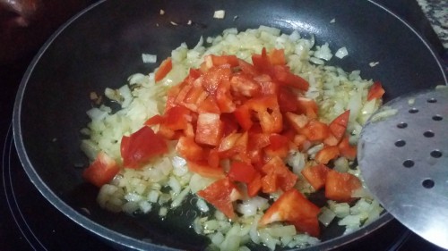 y sofreír durante unos segundos, después añadir la cebolla. Cuando esté transparente añadir el pimiento.