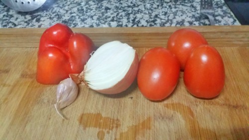 - Picar el diente de ajo, la cebollas y el pimiento.