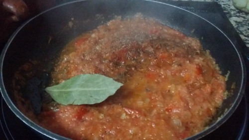 Cuando esté blando el pimiento añadir el tomate triturado. Salar. Añadir un poco de tomillo y la hoja de laurel.