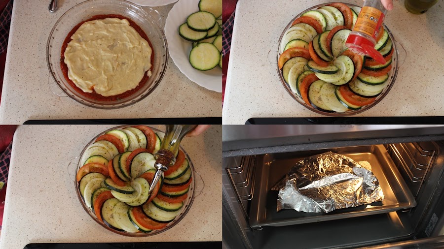 Ponemos una capa de salsa de tomate en el fondo del molde lo espolvoreamos con albahaca, tomillo , pimienta molida. Le ponemos una capa de salsa bechamel y colocamos las rodajas de las verduras en forma de espiral.