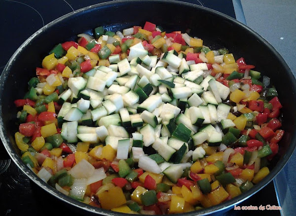 En una sartén grande, ponemos el aceite a calentar, salpimentamos todas las verduras. Una vez caliente el aceite echamos la cebolla, el ajo y las tres clases de pimiento, freímos durante unos minutos, abrimos un círculo en el centro (orilleando las verduras que están a medio freír) y añadimos el calabacín,