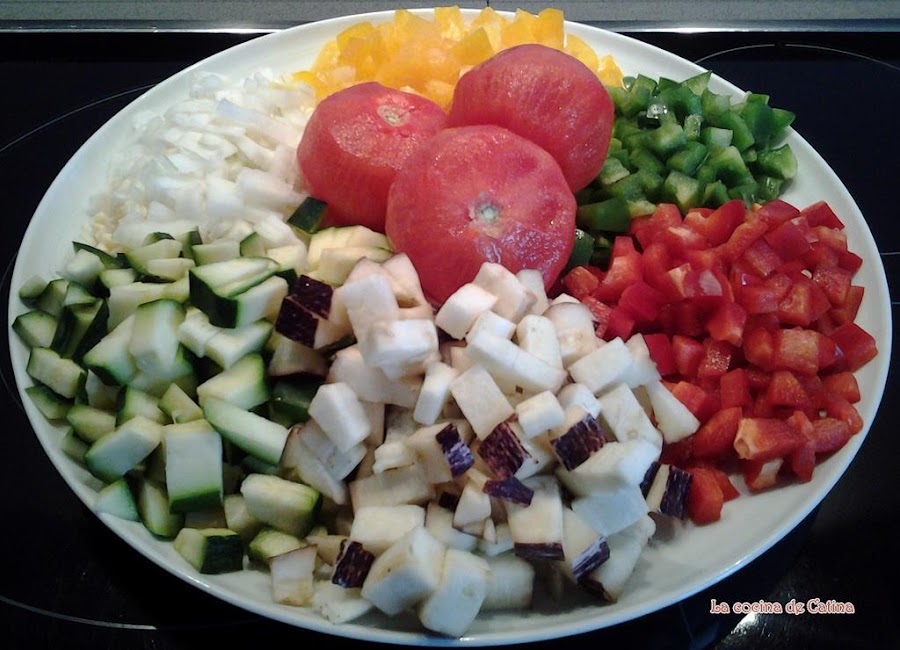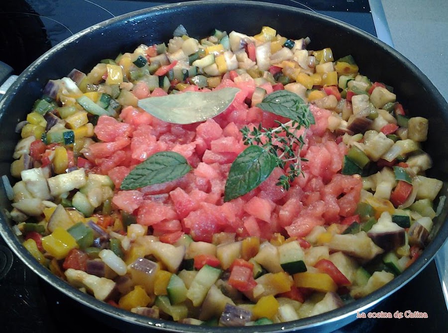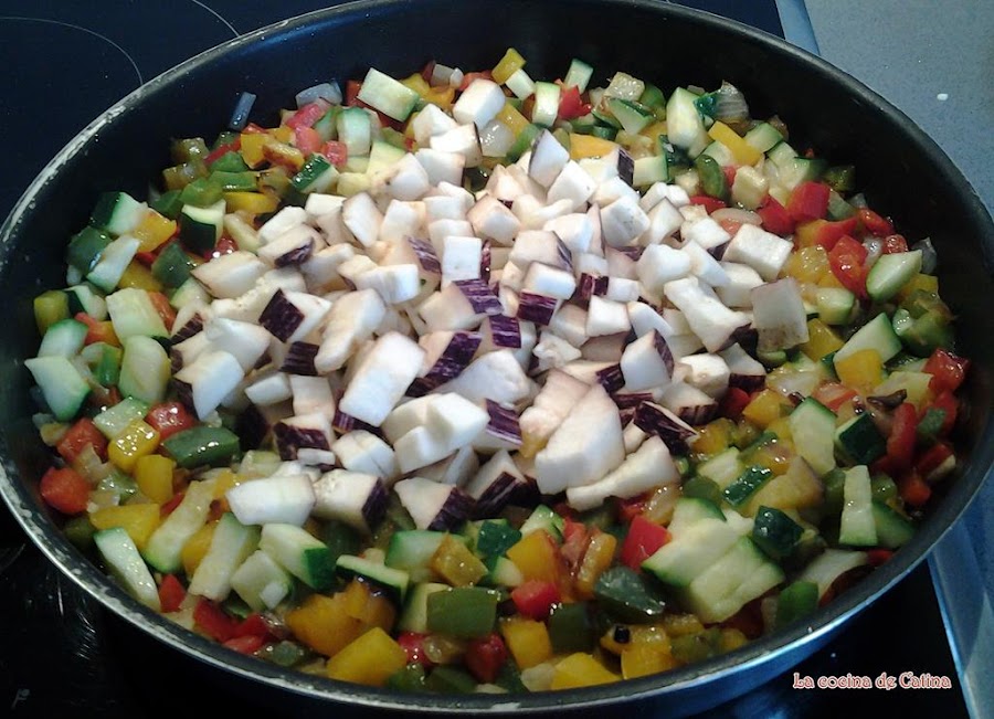 freímos durante 5 minutos, mezclamos con el resto de las verduras y repetimos la operación con las berenjenas y por último el tomate.