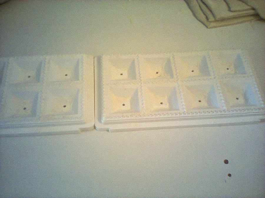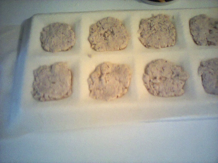 y en el de verdura, usé acelga, zanahoria, morrón y verdeo, todo hervido y procesado, bien condimentado...pongo la masa estirada sobre el molde, pongo el relleno, mojo alrededor para que selle bien pongo la tapa de masa y paso el palote por encima para que se marquen y luego se corten bien....es como un troquelado...tengo la mesa espolvoreada con harina y los voy desmoldando ahí, los doy vuelta con un golpe seco y quedan...los dejamos orear un buen rato, y luego los cocinamos en agua hirviendo con sal.....cuando suben,1 minuto y están listos...