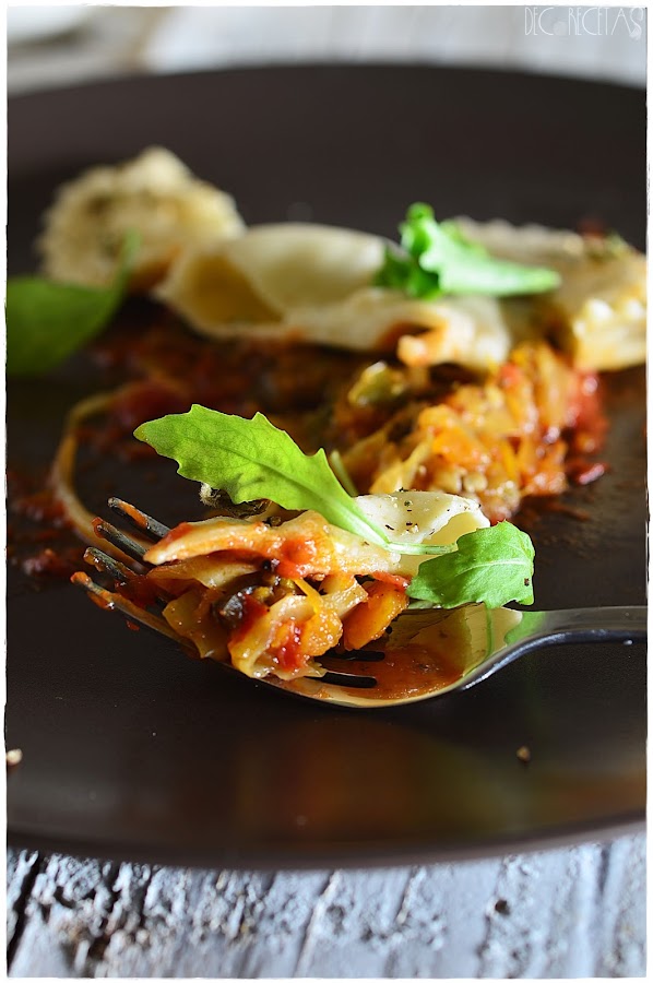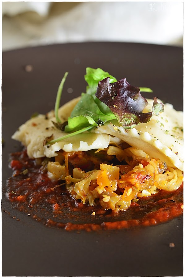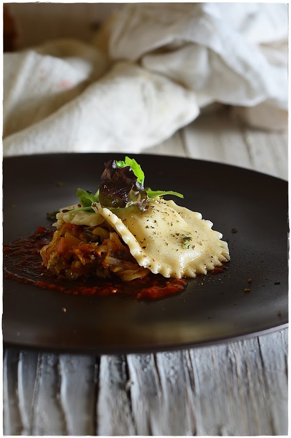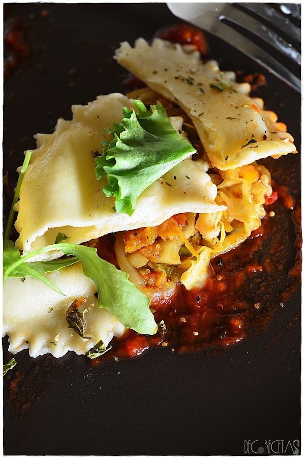 Estos raviolis los rellene de queso mozzarella y los acompañe con una salsa de tomate casera, y unas verduras pochadas como fueron cebolla, calabaza, pimiento rojo y verde, calabacin y berenjena, col y brotes de soja.