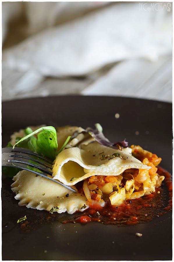 Esta masa la extiendo con la máquina de hacer pasta, relleno con lo que más me guste, y le doy la forma que me apetezca que en este caso es redondeada como podéis observar en las fotos