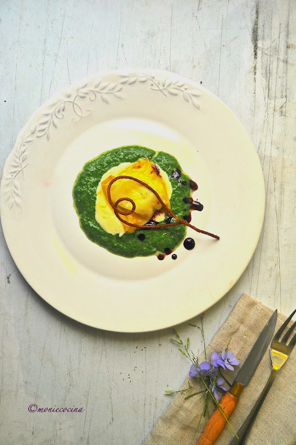 MONTAJE DEL PLATO:Metemos los raviolis en el horno 5 minutos. En la base del plato colocamos la salsa de espinacas, encima la salsa de parmesano y calentamos en el microondas. Sacamos el ravioli y lo colocamos encima de las salsas. Regamos el plato con la reduccion del Oporto y decoramos con el espagueti crujiente. Servimos inmediatamente.