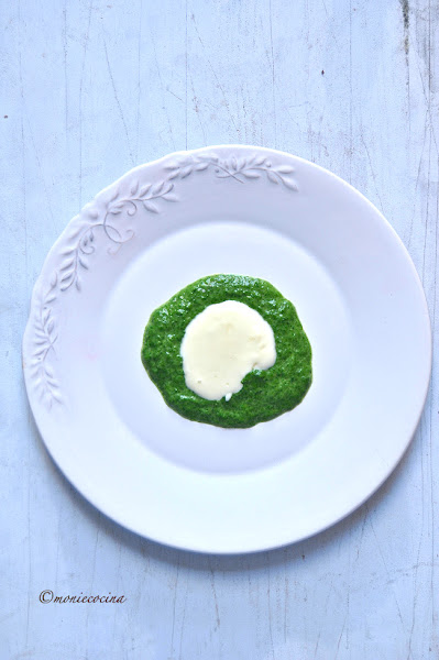 En una sartén ponemos un poco de aceite y rehogamos el puerro cortado en tiras, añadimos las espinacas, salpimentamos, cubrimos con agua y dejamos cocer 2 minutos. Trituramos con la batidora hasta obtener un puré fino, si es necesario podemos añadir agua para hacer más fina la salsa. Reservamos.