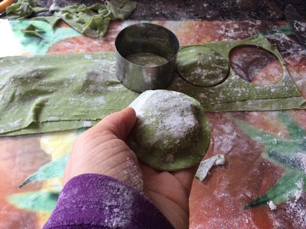 A continuación, enharinada por ambos lados para evitar que se nos pegue, extenderla sobre una superficie plana y marcar suavemente con el cortador que hayamos elegido las formas de nuestros ravioli (como el queso de cabra es redondo, hemos optado por un cortador circular).