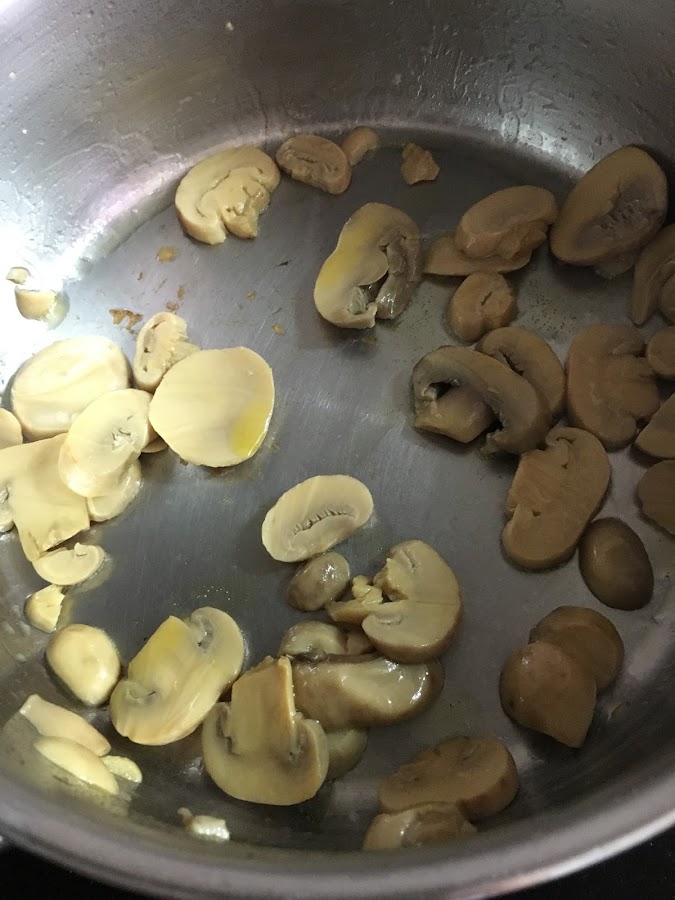Se lavan y cortan los champis y se rehogan en un poco de aceite de oliva. Se reservan.