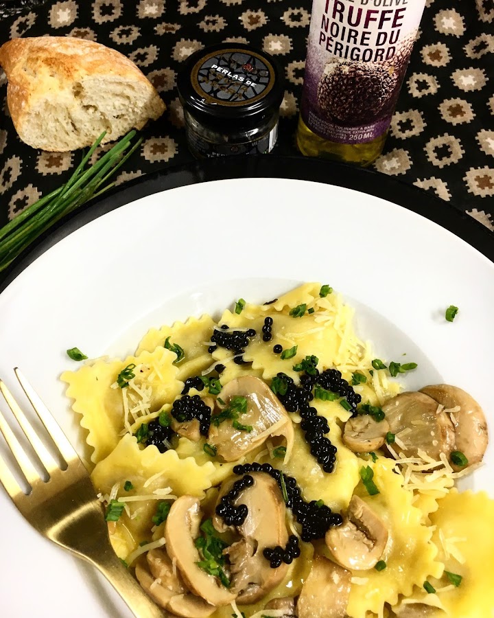 Como decía Serrat en una de sus canciones: un manjar puede ser cualquier bocado. Efectivamente, unos simples ravioli de setas se transforman en un lujo de comida por el efecto de un aceite aromatizado y las perlas de trufa de Espora gourmet a las que me estoy haciendo adicta.