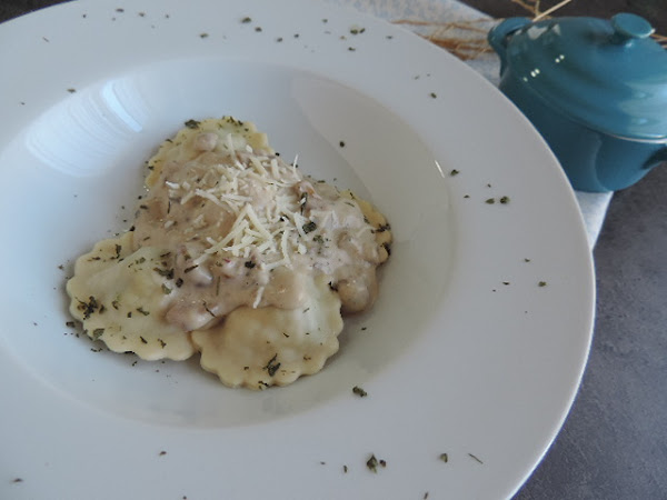 Servimos los raviolis acompañados de la salsa y espolvoreados de queso rallado.