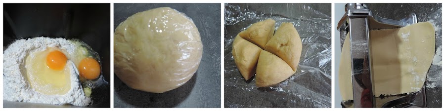 Ponemos la harina,el huevo y una pizca de sal en la cubeta de la panificadora.Programamos el menú 7(amasar pasta fresca).Cuando termine la panificadora sacamos la masa y amasamos un poco.Envolvemos en flim transparente y dejamos reposar una media hora.