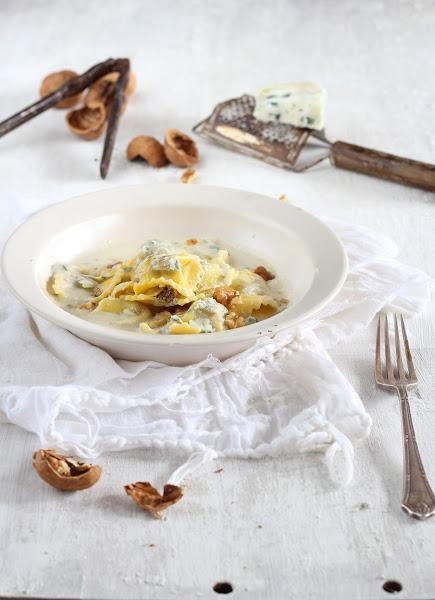Escurrimos la pasta con una espumadera, ponemos la salsa en el fondo del plato, la pasta encima, añadimos unas nueces picadas y si sois muy queseros unos trocitos de roquefort por encima.