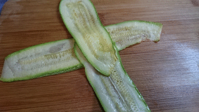 2.- Lavamos los calabacines, los secamos con papel de cocina. Cortamos laminas finas de los calabacines. En una sartén añadimos un poco de aceite de oliva y salteamos unos minutos por ambas caras las laminas de calabacines. Ponemos dos laminas juntas, como se muestras en las fotografías, y luego formamos una cruz con otras dos laminas. En en centro ponemos una cuchara de carne picada (la mezcla que hemos hecho anteriormente). Cerramos las laminas de calabacín, formando un ravioli o una caja. Realizamos la misma operación hasta hacer todos los raviolis.