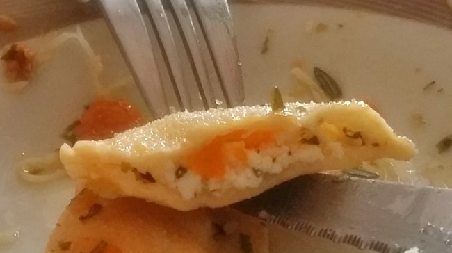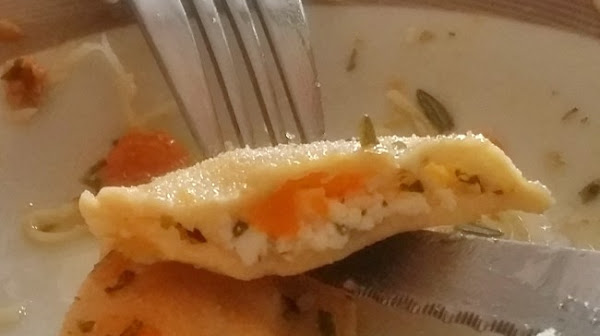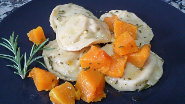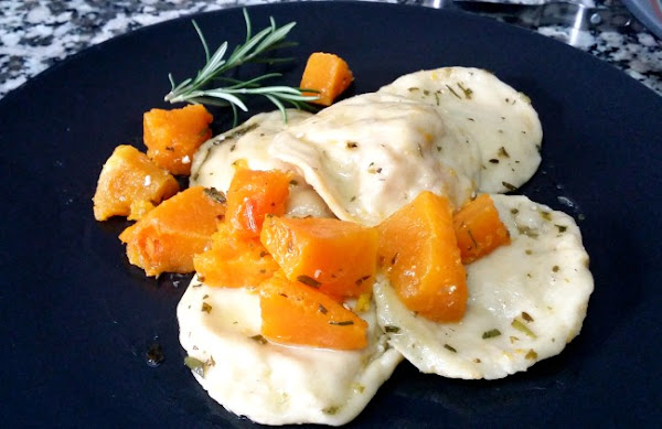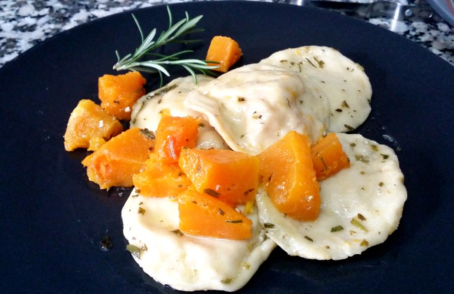 Añadimos los raviolis a la sartén unos y les damos vueltas unos segundos. Servimos en un plato y salseamos con la mantequilla y el orégano sobre los raviolis y servimos con unos dados de calabaza horneada.