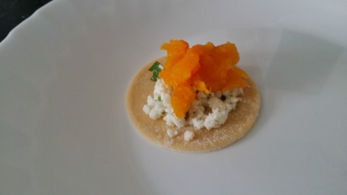 Continuamos disponiendo sobre cada una de las masa dos cucharaditas de relleno y unos daditos de calabaza horneada.