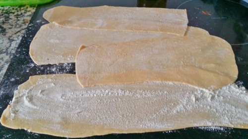 Extirar la masa con la maquina de hacer pasta, hasta el número 5. En caso de no tener máquina de hacer pasta tendrás que estirar la masa con un rodillo dejándola lo más fina posible.