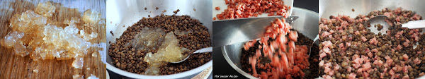 En un bol colocar el cotechino, la gelatina y las lentejas y mezclar hasta obtener una mezcla homogénea. El relleno está listo, reservar en la nevera.