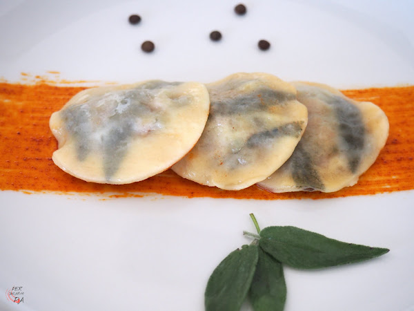 Para montar el plato pintar en la base un trazo grueso con el aceite de pimentón y colocar encina los raviolis, pintados con la mantequilla clarificada. Servir y disfrutar!