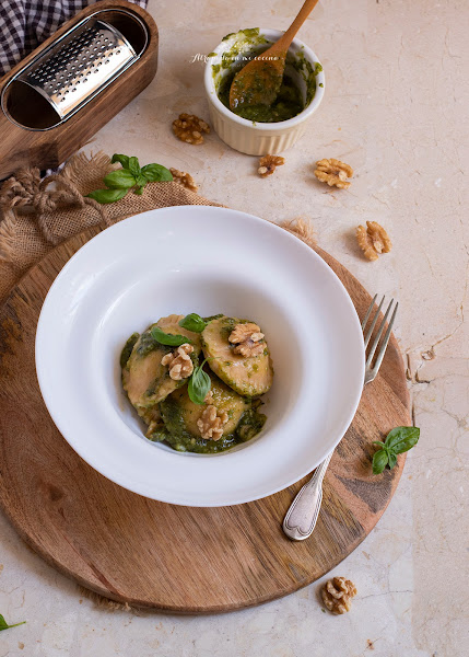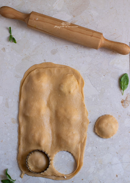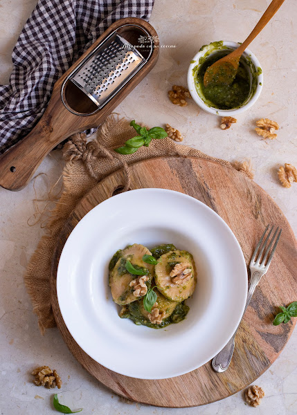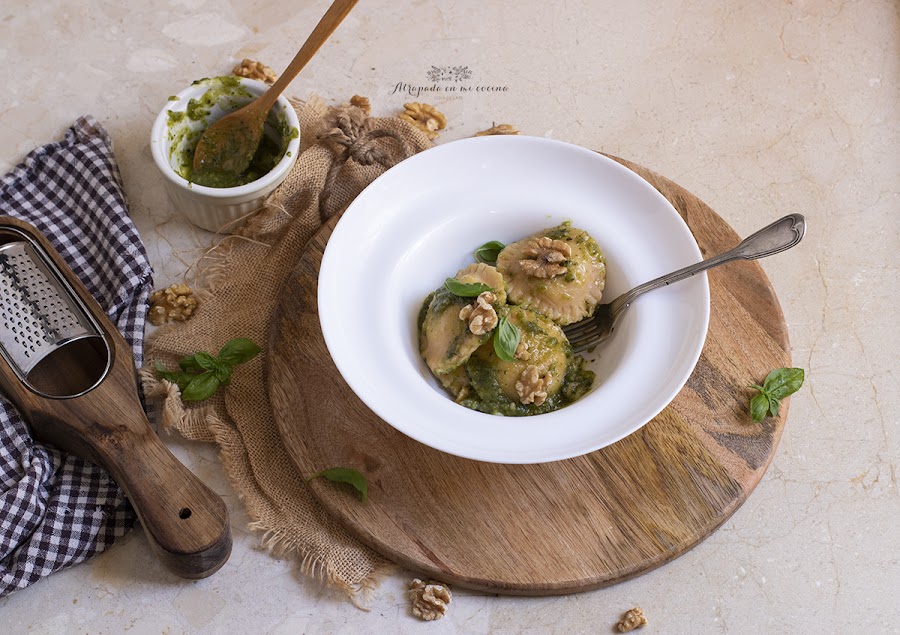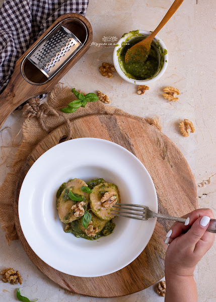 Para empezar la semana os enseño a preparar unos riquísimos raviolis caseros, rellenos de una crema de cuatro quesos y nueces, y bañados en salsa pesto de albahaca y nueces. No vamos a necesitar máquina de hacer pasta casera, aunque si la tenéis y queréis usarla os vendrá muy bien para estirar la masa. Si no la tenéis pues la estiráis con un rodillo. Y luego para cortarla he usado un cortador redondo rizado. El resultado es una pasta con un delicado relleno y con una salsa deliciosa. Podéis hacer los raviolis del tamaño que más os gusten, los míos eran grandes, por lo que con tres o cuatros vais bien servidos.