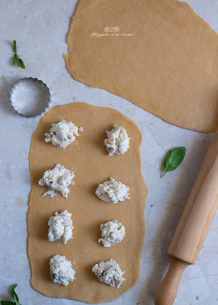 Sobre uno de ellos vamos poniendo montoncitos no muy grandes de relleno, separados entre si, y cubrimos con la otra parte de la masa.