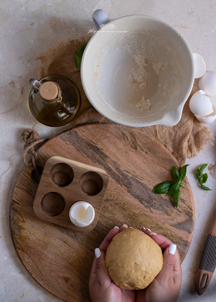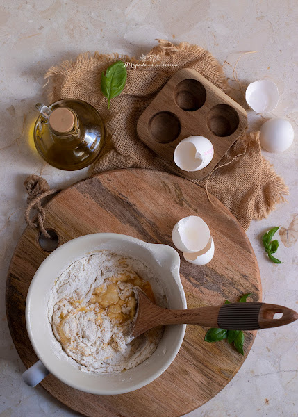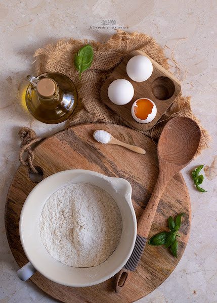 Ahora preparamos la masa, para ello batimos los huevos y los añadimos a la harina, junto con la sal, mezclamos bien y sacamos. Trabajamos la masa sobre la encimera para obtener una masa lisa y elástica. Cubrimos con film transparente y dejamos reposar durante unos 30 minutos.