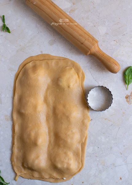 Presionamos con las manos para que no quede aire dentro y luego cortamos los raviolis. Si vemos que no quedan bien sellados, podemos usar un tenedor para sellar bien los filos. Cuando acabemos la masa volvemos a hacer una bola con ella y dividimos de nuevo en dos mitades, procediendo de la misma forma hasta acabar la masa ( a mi me salieron 15 raviolis grandes).