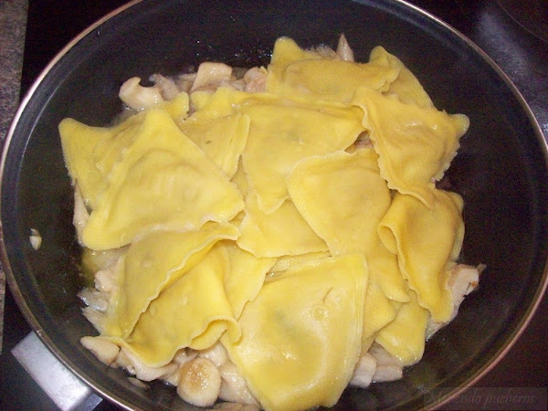 Cuando el agua rompe a hervir echamos la pasta. Recordar que se trata de pasta fresca por lo que en 3 ó 4 minutos estará lista. Veréis que los raviolis se inflan en ese tiempo y eso es señal de que están hechos.