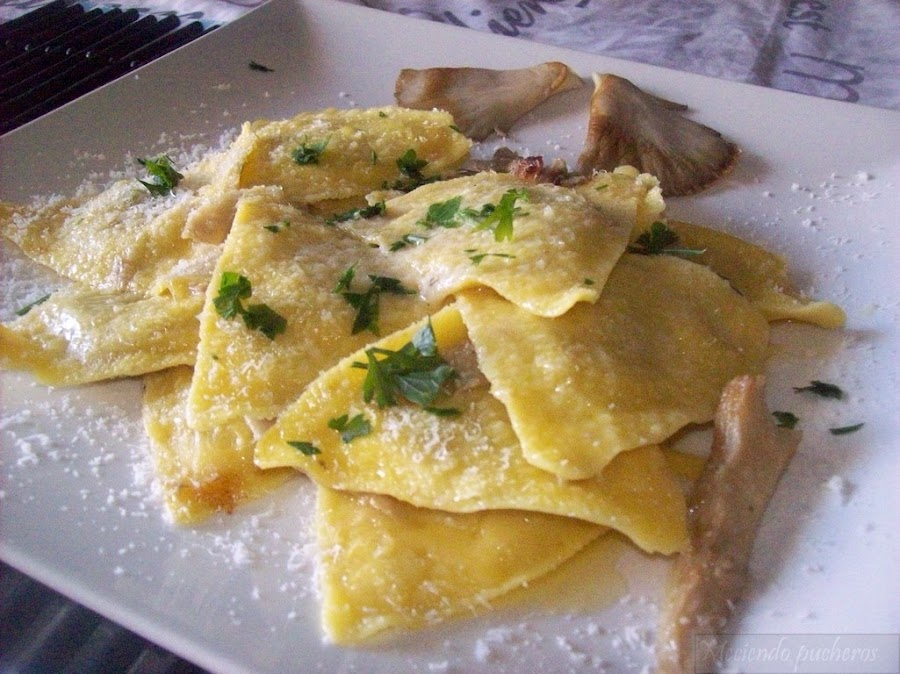 Hace un par de semanas, una compañera de trabajo, Susana, me trajo unos raviolis de pasta fresca rellenos de boletus y trufa blanca para que los probase. Desde el principio tienes claro que estás delante de un producto de primera calidad. De un lado la pasta fresca y de otro, que está relleno de dos productos "5 estrellas" por lo que lo aconsejable, a mi juicio, es no tocarlo demasiado. No enmascararlo con salsas y dejar que el propio producto sea la estrella del plato.