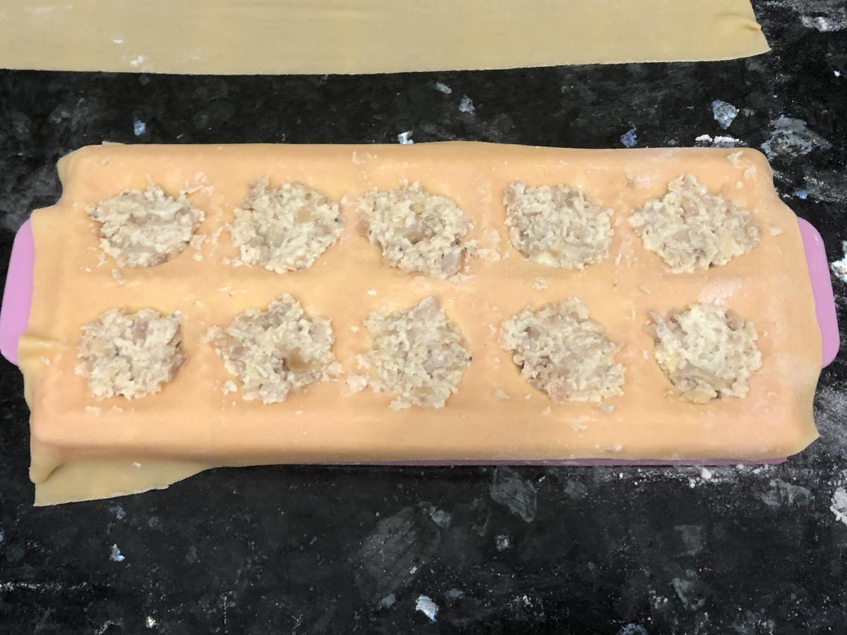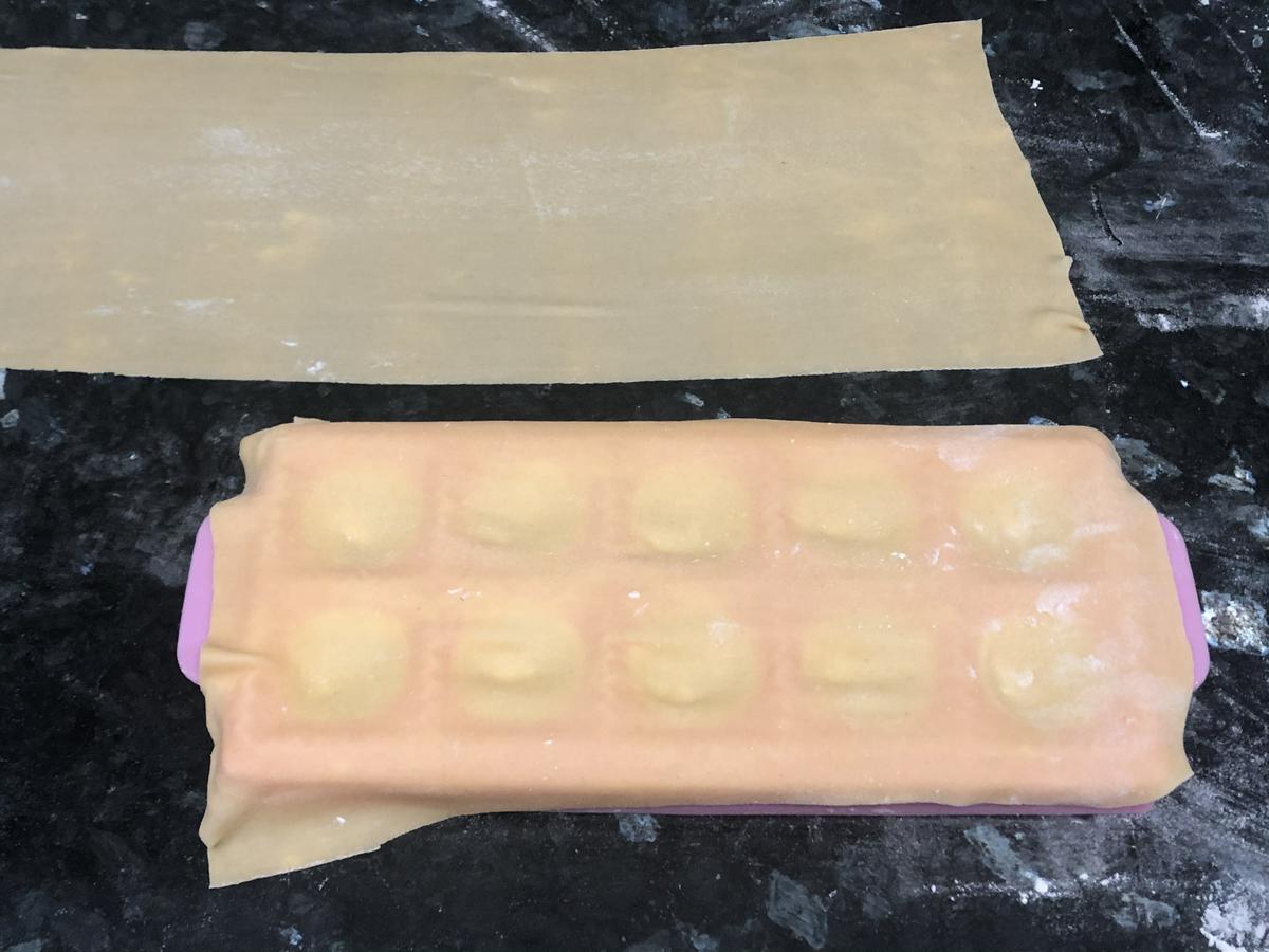 2. Superponemos la tira de masa, que quede holgada. Distribuimos el relleno en los huecos sin poner mucha cantidad, porque si lo llenamos demasiado, no podremos pegar bien los raviolis y se abrirán al cocer. Cortamos la masa dejando un margen con el borde de la bandeja.