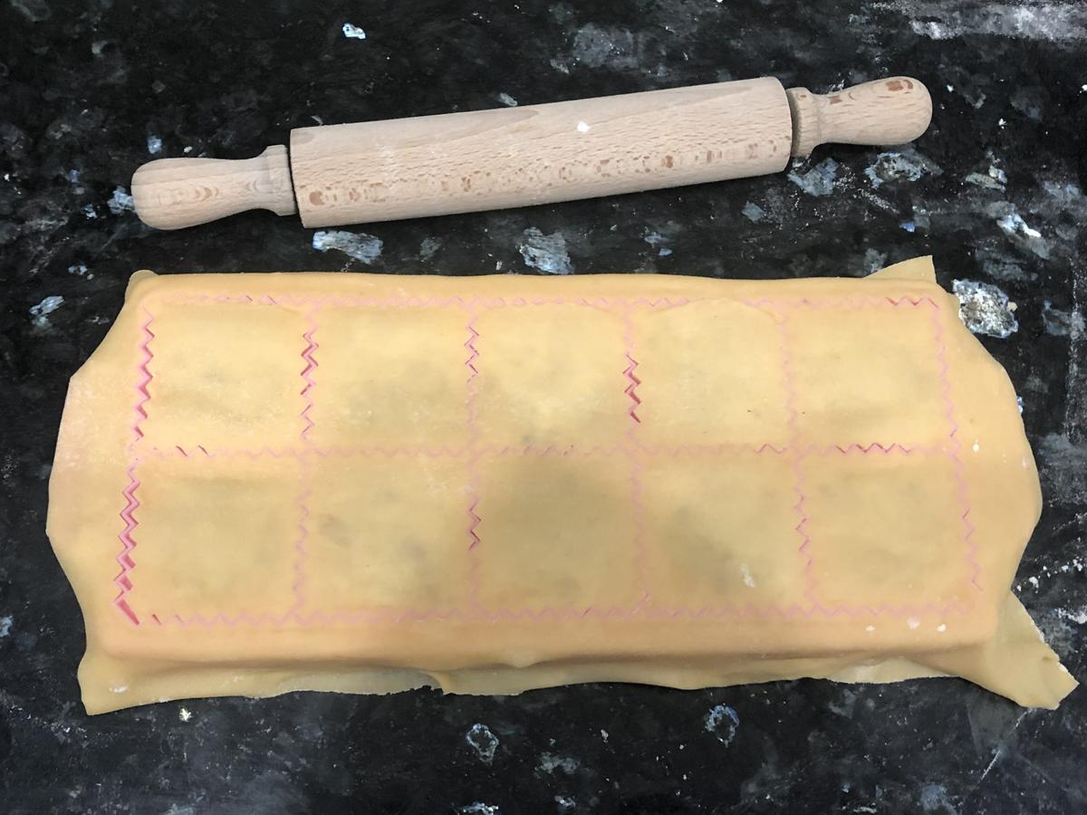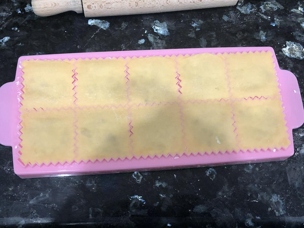 3. Pintamos con agua los bordes de la masa y los espacios entre ravioli y ravioli.
