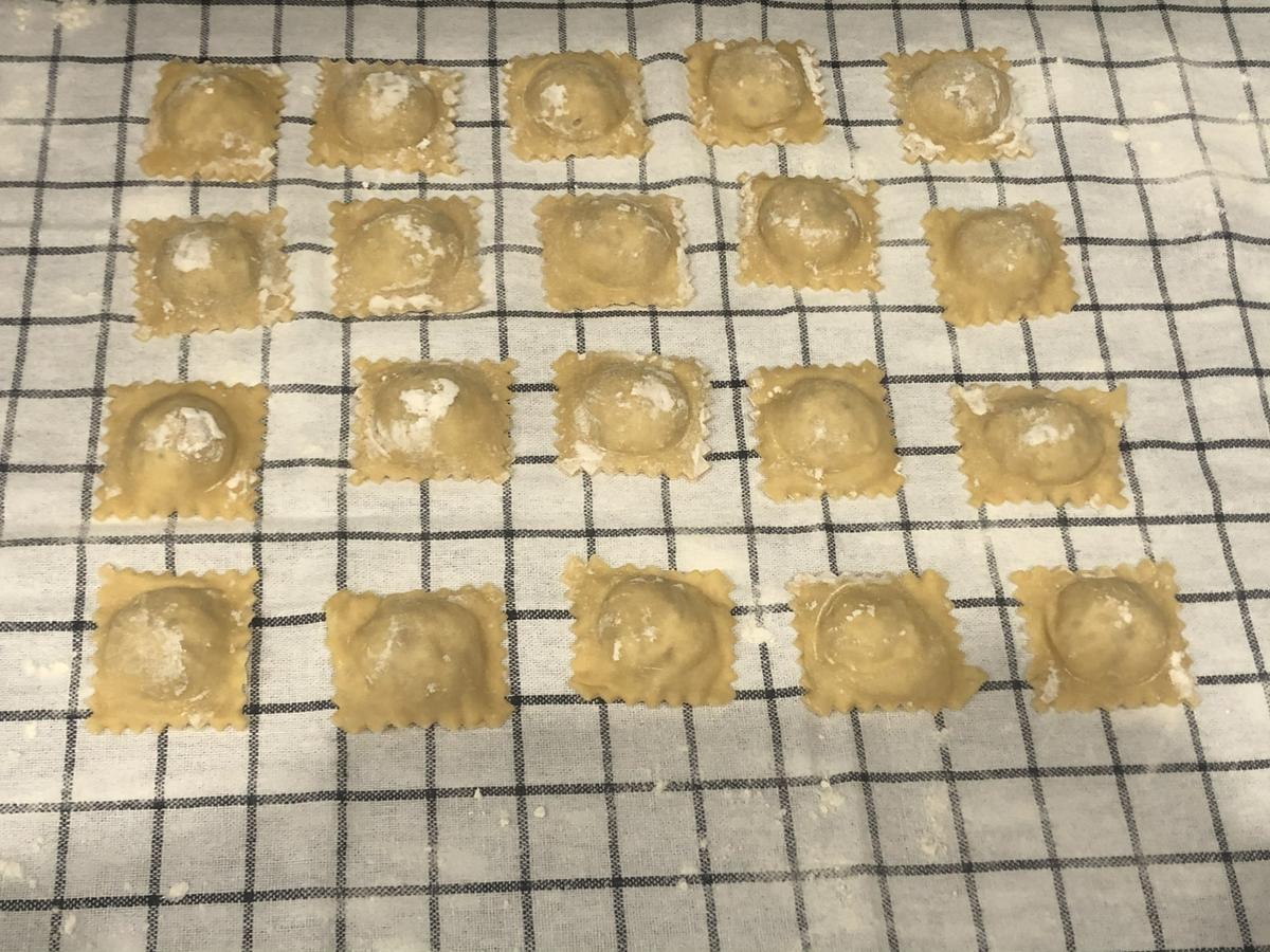 5. Damos la vuelta a la bandeja sobre un paño limpio y como no, espolvoreado de harina. Mi bandeja, tiene digamos filo, y se corta solo al pasar el rodillo. Los raviolis caen y solo hay que quitar la masa sobrante de los bordes. Si usáis una bandeja no cortante, se retira el exceso de masa y se separan los raviolis con una ruleta o cuchillo. Dejamos secar sobre el paño mientras vamos rellenando el resto. A mi me han salido 20 raviolis.