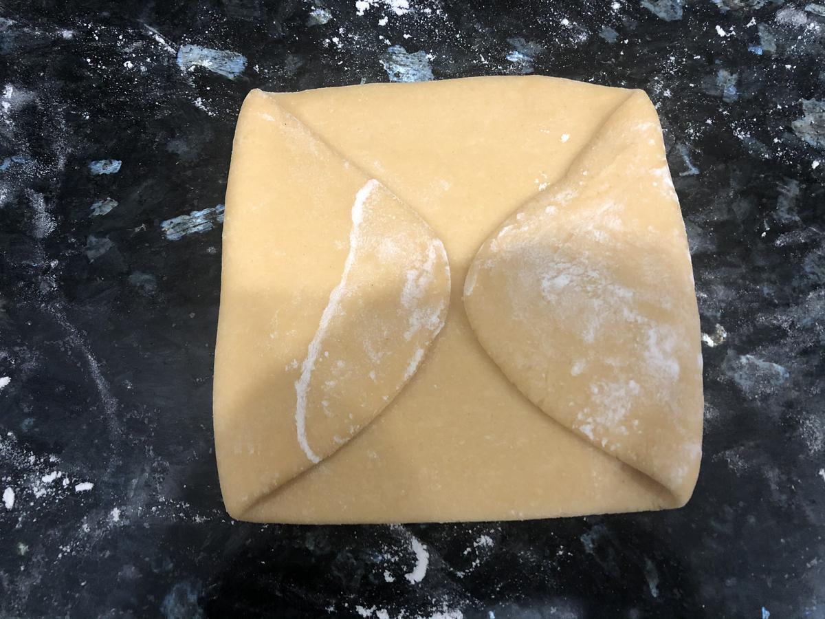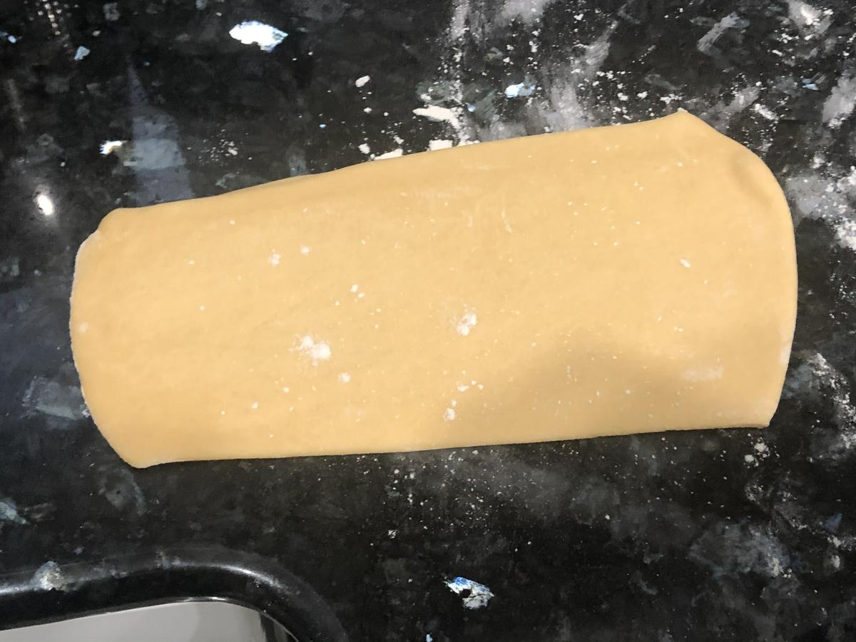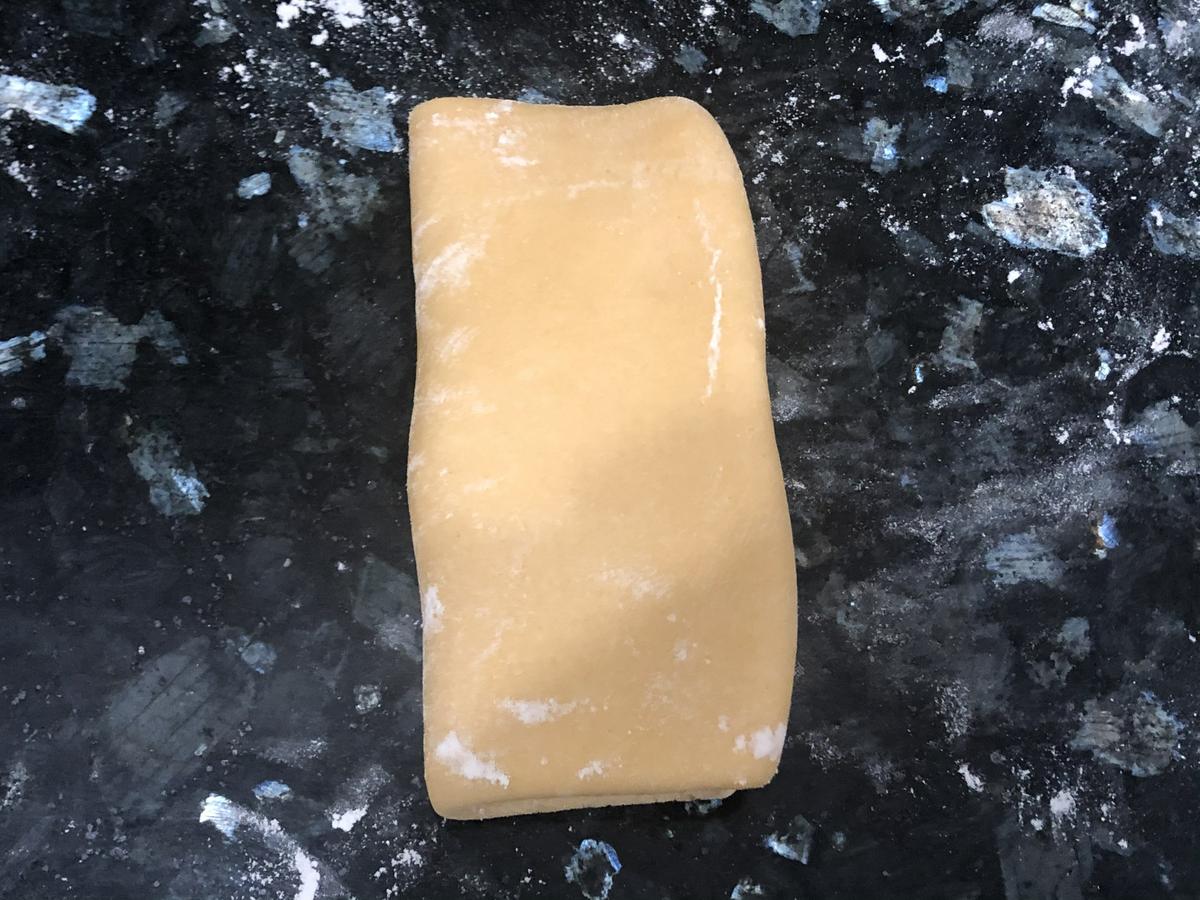 1. Pasamos una vez la masa, la doblamos en tres partes como un papel y pasamos otra vez por la máquina. La doblamos otra vez y volvemos a pasar.