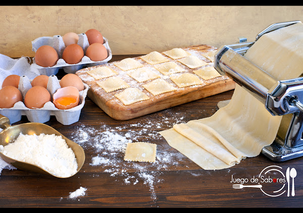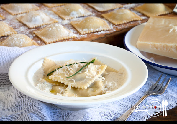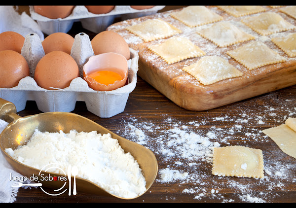 La de hoy es una receta laboriosa porque hay que hacer la masa, el relleno y la salsa. Pero ya os decimos de entrada que el trabajo compensa y el resultado está para chuparse los dedos. Los raviolis, plural de raviolo que quiere decir “plegado”, es una de las muchas pastas rellenas de la cocina italiana. Este relleno puede ser de cualquier cosa, verduras, carnes, quesos Nosotras hemos optado por las setas y el foie. Es una combinación perfecta. La forma de los raviolis puede ser cuadrada, redonda o semicircular. Hemos empezado diciendo que la receta es laboriosa porque hay que hacerla a mano, pero si tenéis máquina para extender la pasta siempre os será de gran ayuda.