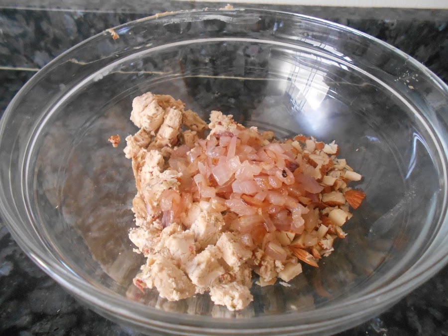 Picamos las almendras y las añadimos junto con el queso en un cuenco. Agregamos la cebolla que había reservado de la salsa.