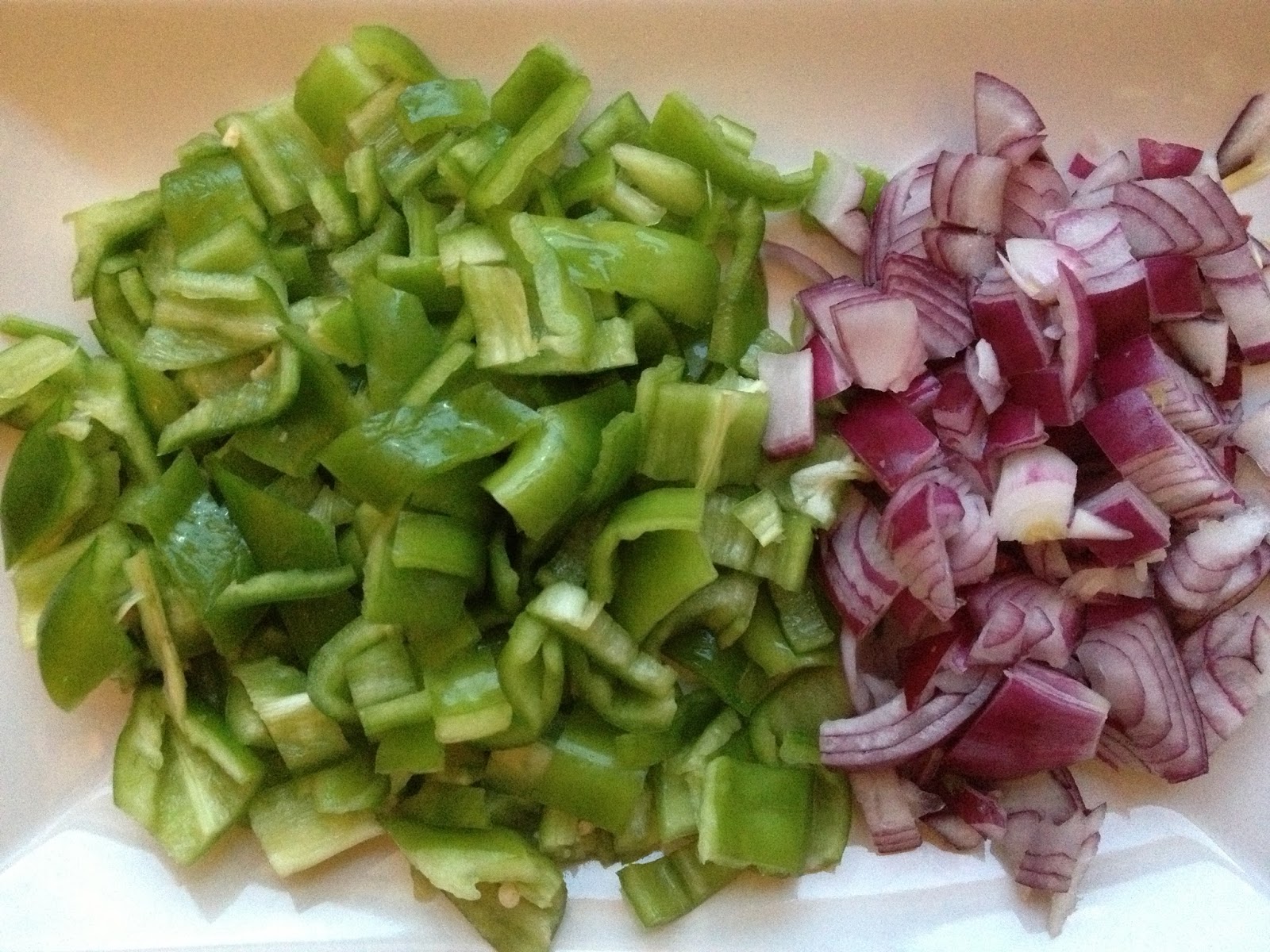 1 Cortamos la cebolla morada y los pimientos en cachitos , es decir en brunoise , no es necesario que sean demasiados pequeños , a continuación ponemos a calentar la sartén con un pelin de aceite .
