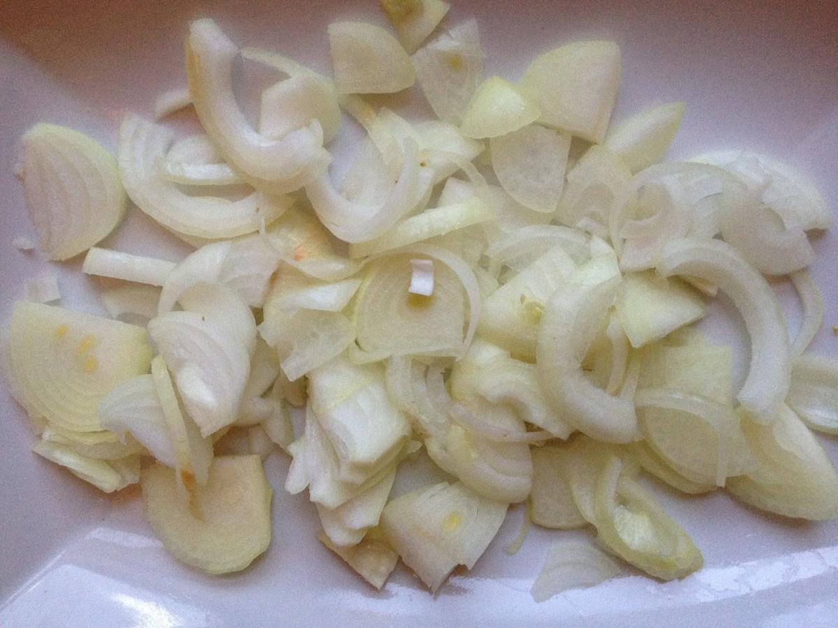 3 Una vez cortada la cebolla , ponemos a calentar otra sartén con un poquito de aceite y cuando notemos que el aceite esta caliente, añadimos las cebolla , bajamos también la intensidad del fuego y dejamos que poco a poco se poche ..