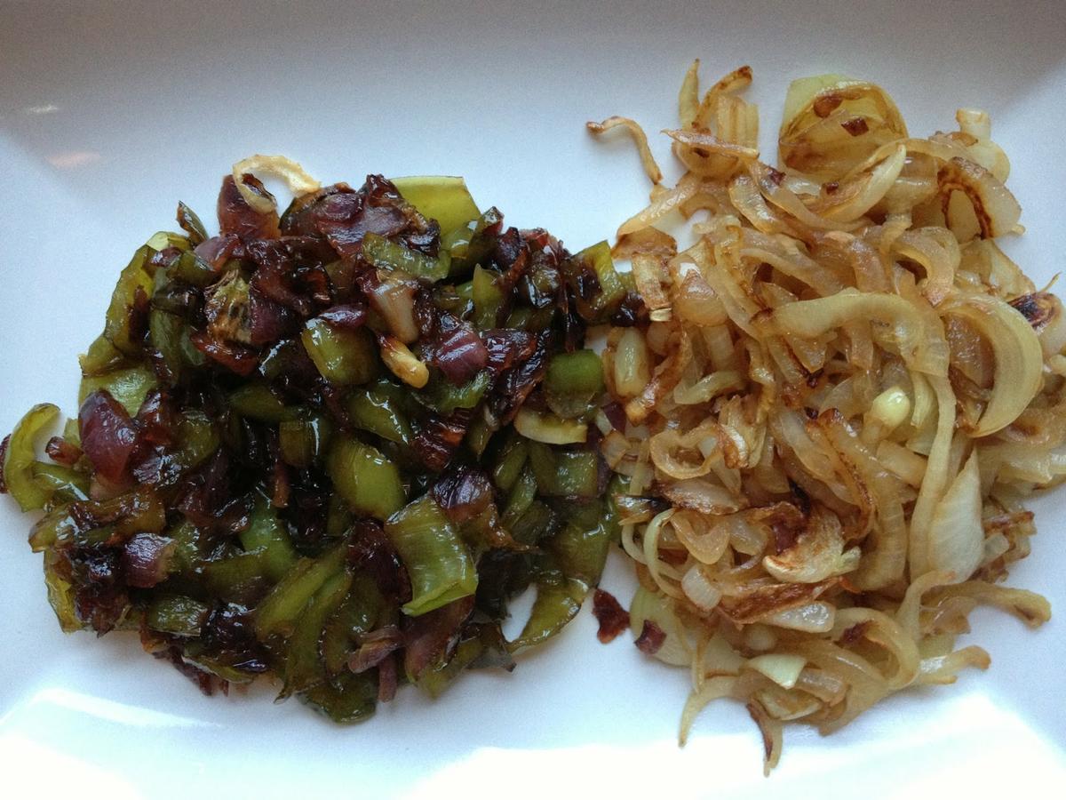 2 Dejamos que poco a poco se cocinen los pimientos y comenzamos a cortar en juliana o en tiras , las cebollitas Francesas.