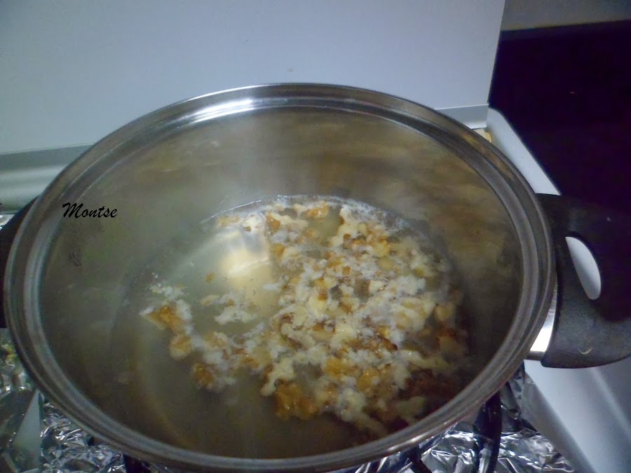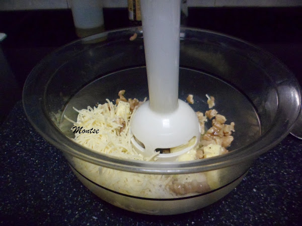 Pondremos un cazo pequeño con agua y cuando empiece a hervir echaremos las nueces y el ajo y lo dejaremos un minuto.