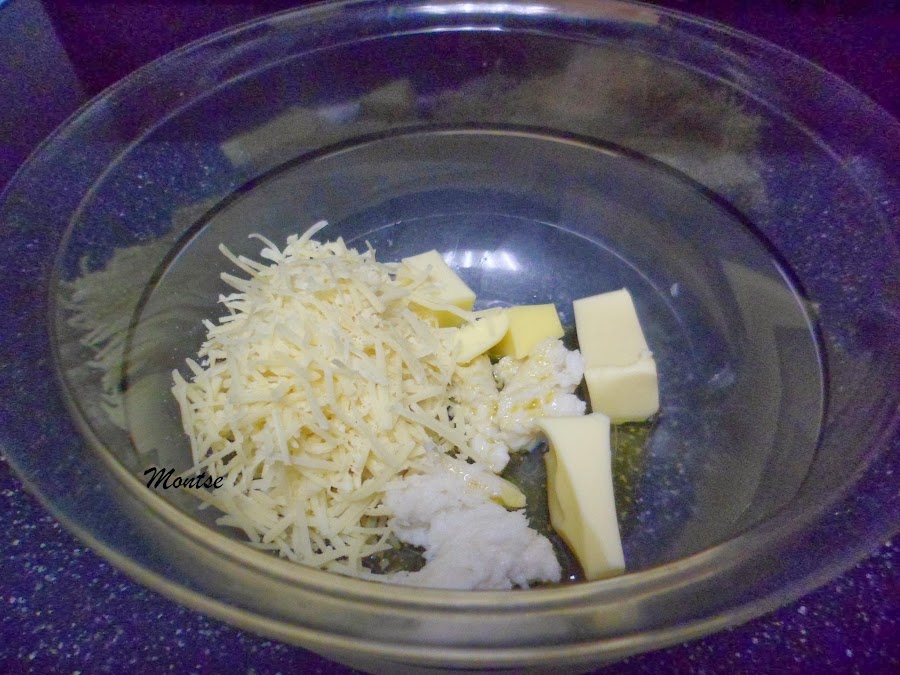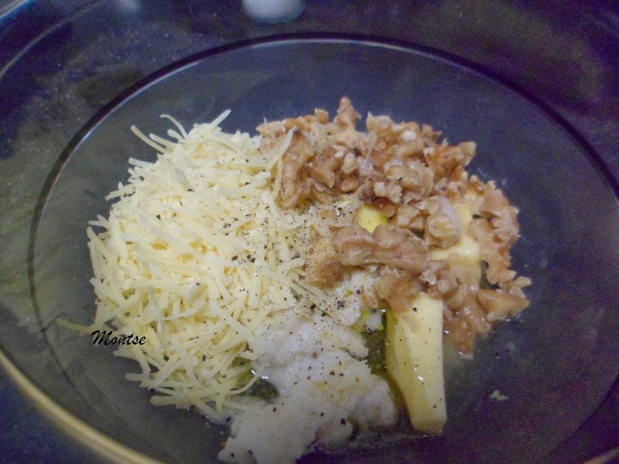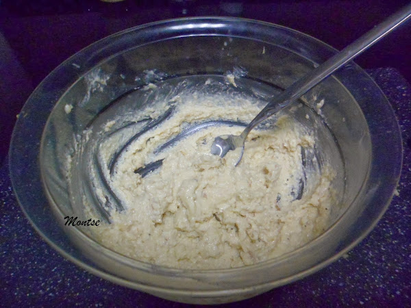 Empezaremos con la salsa. En un bol pondremos el pan remojado, el queso rallado, el aceite y la mantequilla.