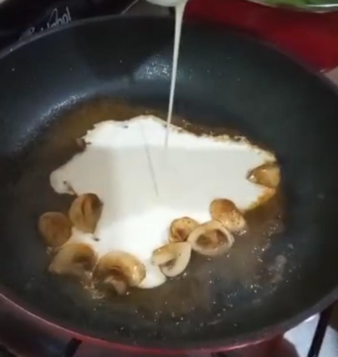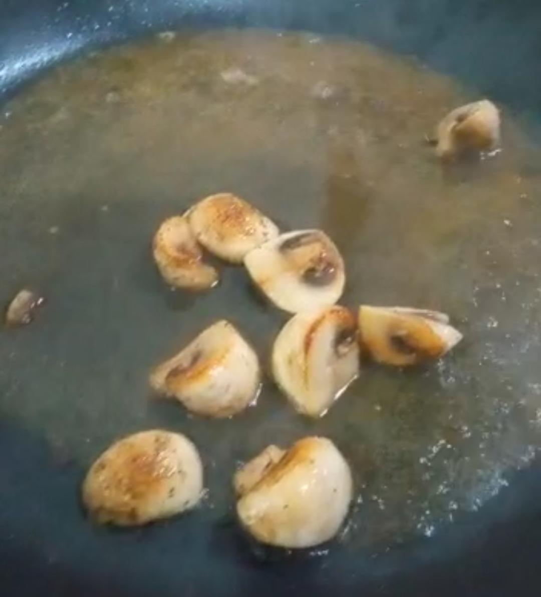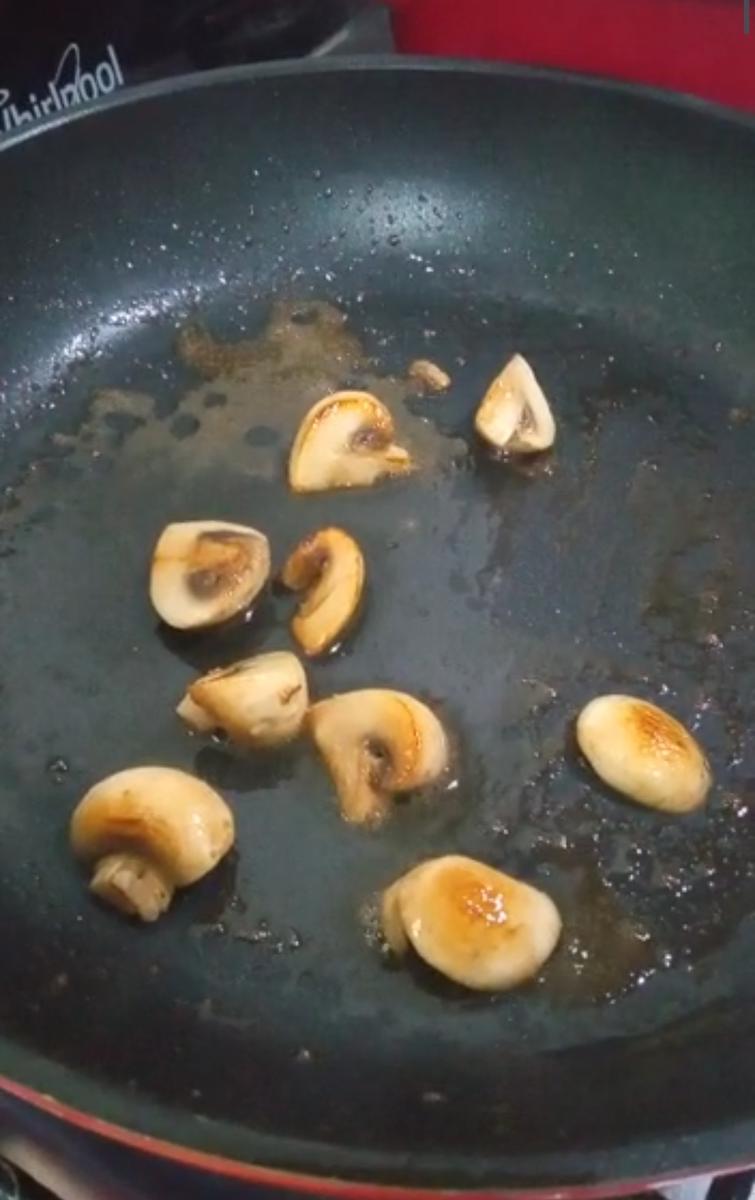 Lavar y cortar los champiñones escalopados ( en cuartos), Cómo limpiar los champiñonesDerretir una cuchara de manteca en una sarten y agregar los champiñones y dorar