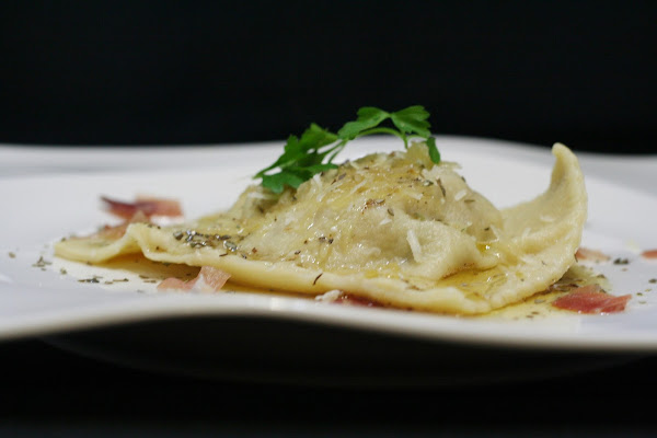 RAVIOLONI RELLENOS DE BURRATA, SPECK Y BOLETUS