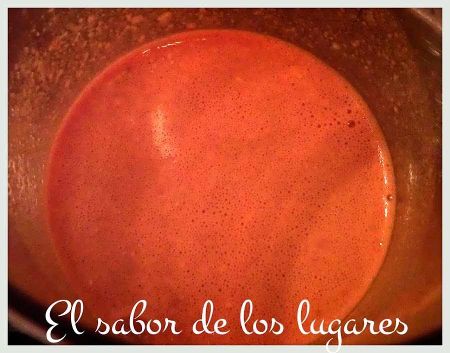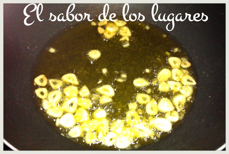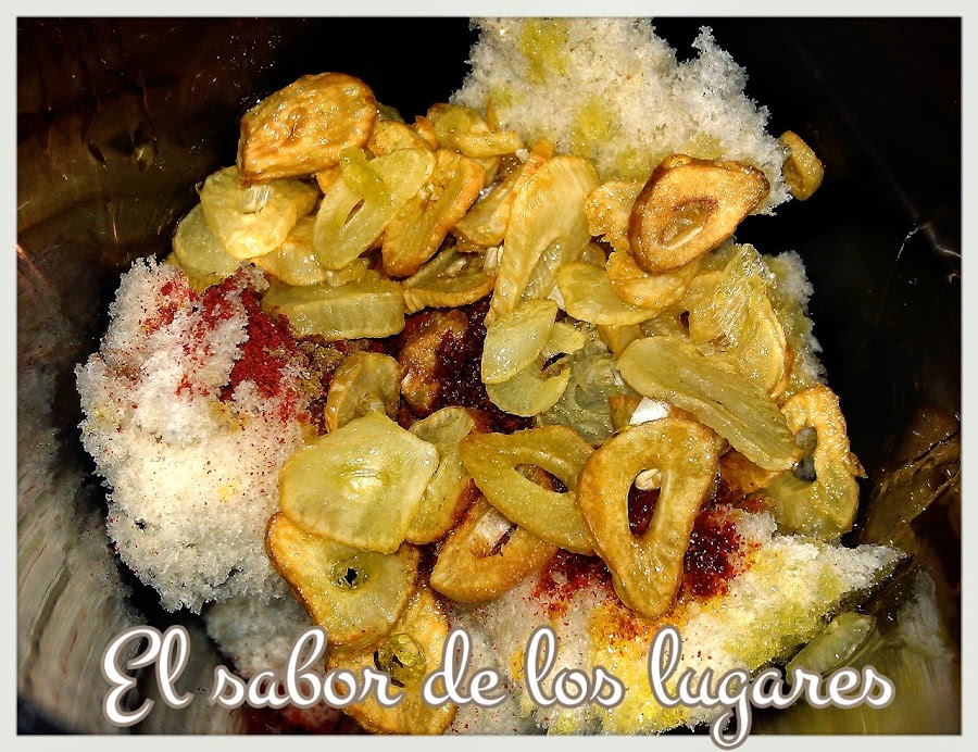 Coloca una cazuela grande al fuego con 3 o 4 cucharadas de aceite de oliva, sofríe los dientes de ajo laminados. Cuando comiencen a tomar color, retira y pásalos al vaso de la batidora junto con la miga de pan, la cucharada de pimentón, la 1/2 cucharadita de comino y 1/2 vaso de agua. Bate y vierte de nuevo en la cazuela junto con el aceite de haber sofrito los ajos.
