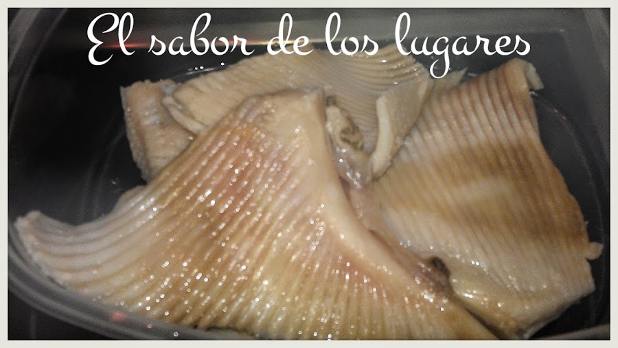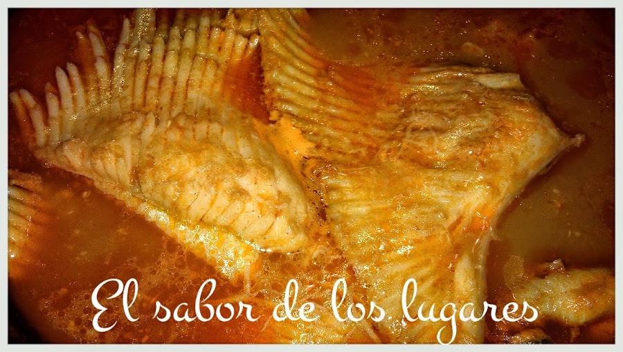 Pon una olla con agua y sal al fuego, cuando comience a hervir escalda los trozos de raya unos 2 minutos, escurre y si quedan restos de piel (una especie de velo o tela transparente) retírala. Reserva.