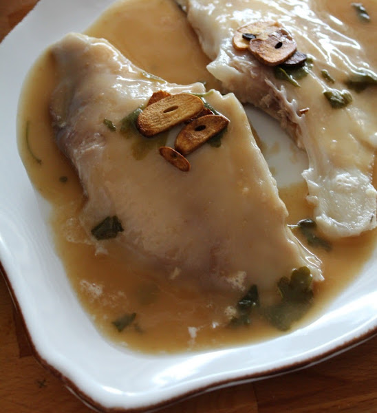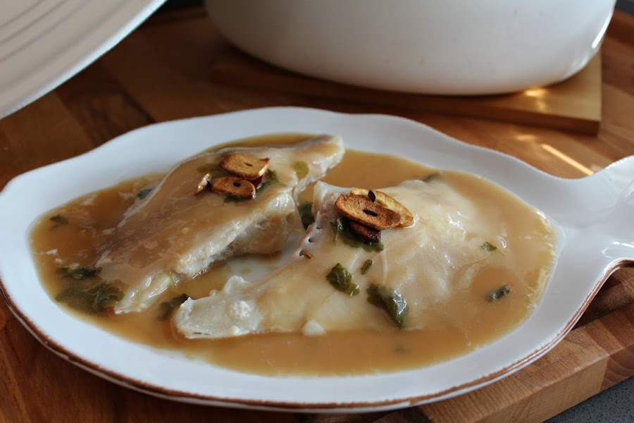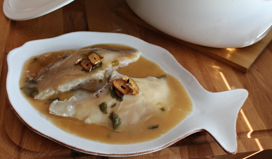 Servimos napando el pescado y adornando con láminas de ajo frito.