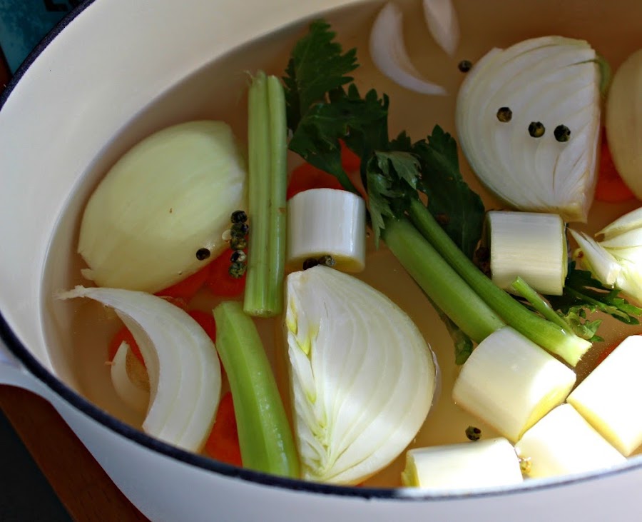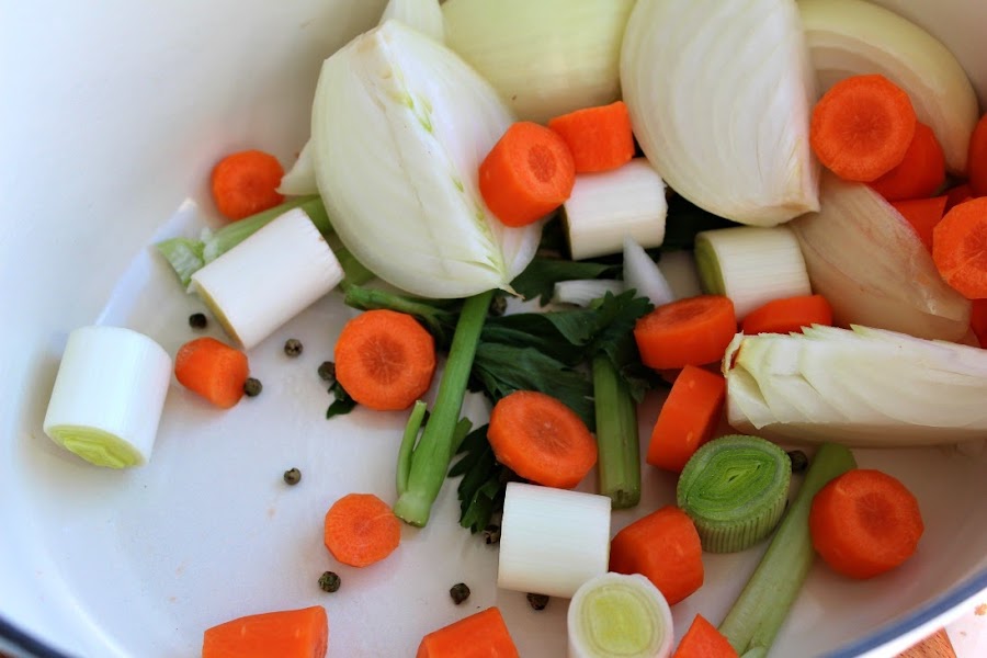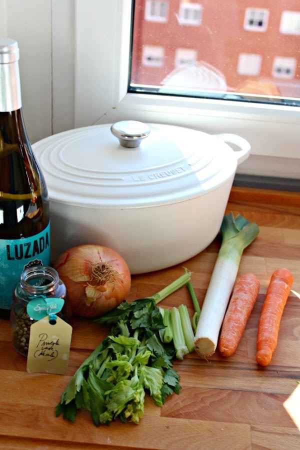En una cazuela, ponemos los ingredientes para el caldo.