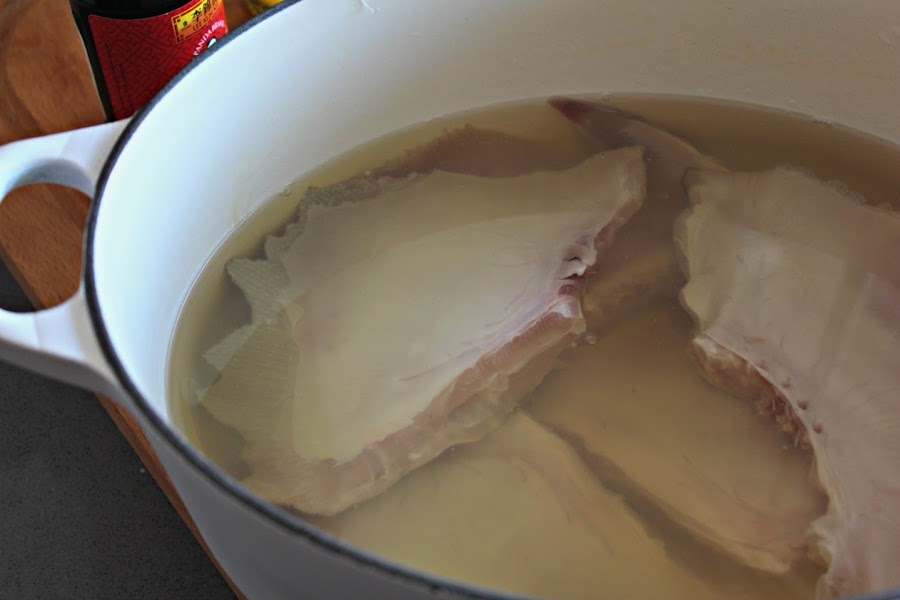 Ponemos el caldo, con la raya, al fuego (puedes hacerlo mientras preparas la bechamel). Cuando comience a hervir, sacamos del fuego, tapamos y dejamos reposar 15 minutos.