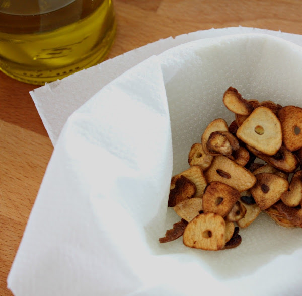 En una sartén con aceite, doramos unas láminas de ajo y dejamos escurrir sobre papel absorbente.